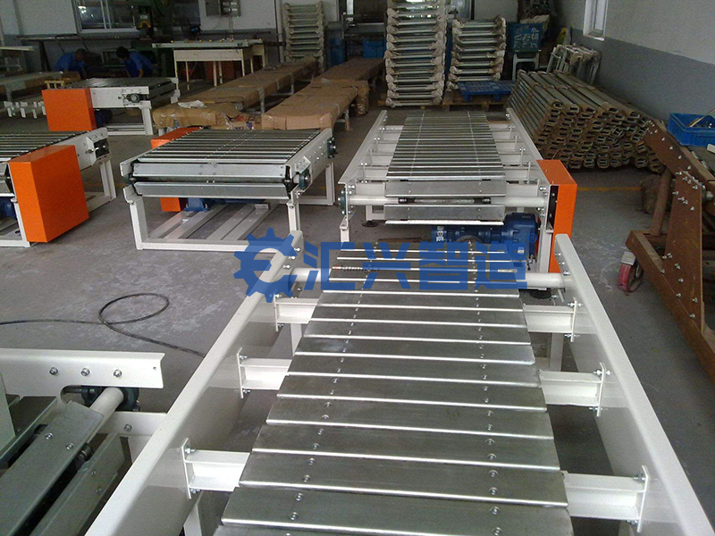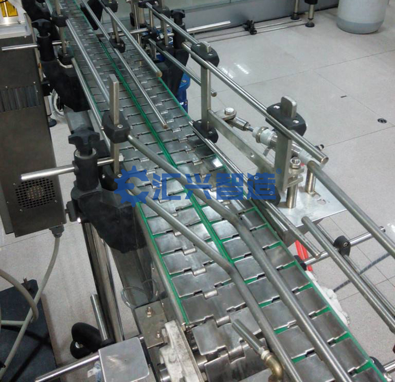 鏈板輸送線以標準鏈板為承載面,由馬達減速機為動力傳動;我們可以通過多列鏈板并行,使鏈板輸送線做的很寬并形成差速,利用多列鏈板的速度差使多列輸送在無擠壓的情況下變?yōu)閱瘟休斔停瑥亩鴿M足飲料貼標、灌裝、清洗等設備的單列輸送的要求,同樣也可以使單列變成多列并行走緩慢,從而產(chǎn)生儲存量,滿足殺菌機、儲瓶臺、冷瓶機的大量供料的要求,我們可以將兩條鏈板輸送線的頭尾部做成重疊式的混合鏈使得瓶(罐)體處于動態(tài)過度狀態(tài),使輸送線上不滯留物料,可以滿足空瓶以及實瓶壓力和無壓力輸送。