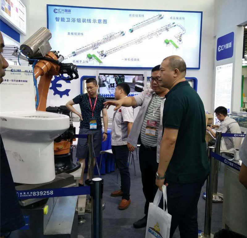 匯興智造展出的陶瓷衛(wèi)浴打磨機器人綻放異彩,從加工、組裝、噴涂、打磨、焊接、輸送等各種制造環(huán)節(jié)的機器人,到智能化、定制化的衛(wèi)浴生產(chǎn)線的應(yīng)用,深深地吸引參展觀眾的圍觀。