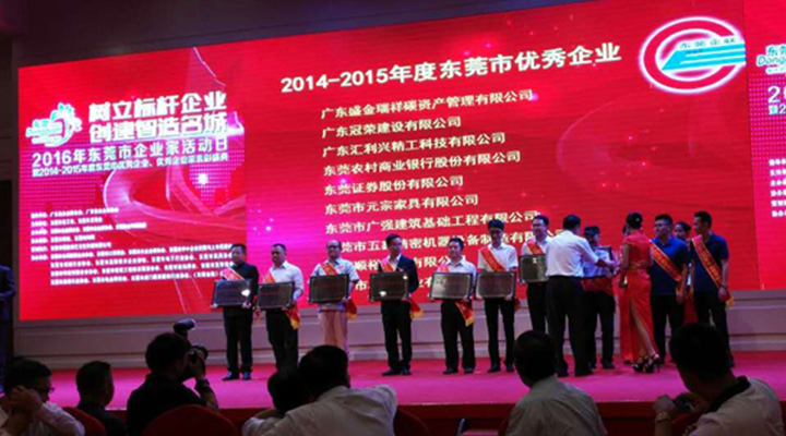 東莞市企業(yè)聯(lián)合會、東莞市企業(yè)家協(xié)會,于2016年5月25日18:30在東莞國際會展大酒店隆重舉行“2015年度東莞市優(yōu)秀企業(yè)、優(yōu)秀企業(yè)家表彰盛典”。匯利興集團“破五關“脫穎而出,榮獲 “2014/2015年度東莞市優(yōu)秀企業(yè)”。