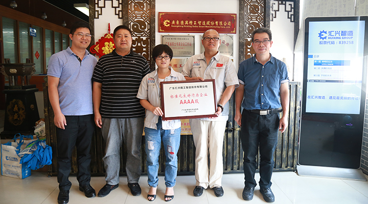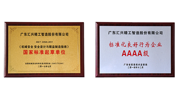 2017年8月30日,經(jīng)廣東省質(zhì)量技術(shù)監(jiān)督局、省標(biāo)準(zhǔn)化協(xié)會(huì)專家組的現(xiàn)場(chǎng)評(píng)審,廣東匯興精工智造股份有限公司(股票代碼:839258)再度獲評(píng)為“AAAA級(jí)標(biāo)準(zhǔn)化良好行為企業(yè)”及《機(jī)械安全 安全設(shè)計(jì)與精益制造指南》國(guó)家標(biāo)準(zhǔn)起草單位,在行業(yè)中到示范引領(lǐng)作用。