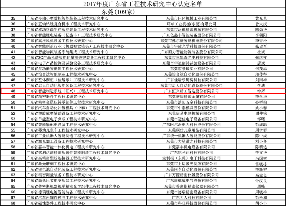 廣東省智能制造系統(tǒng)(匯興)工程技術(shù)研究中心認(rèn)定名單