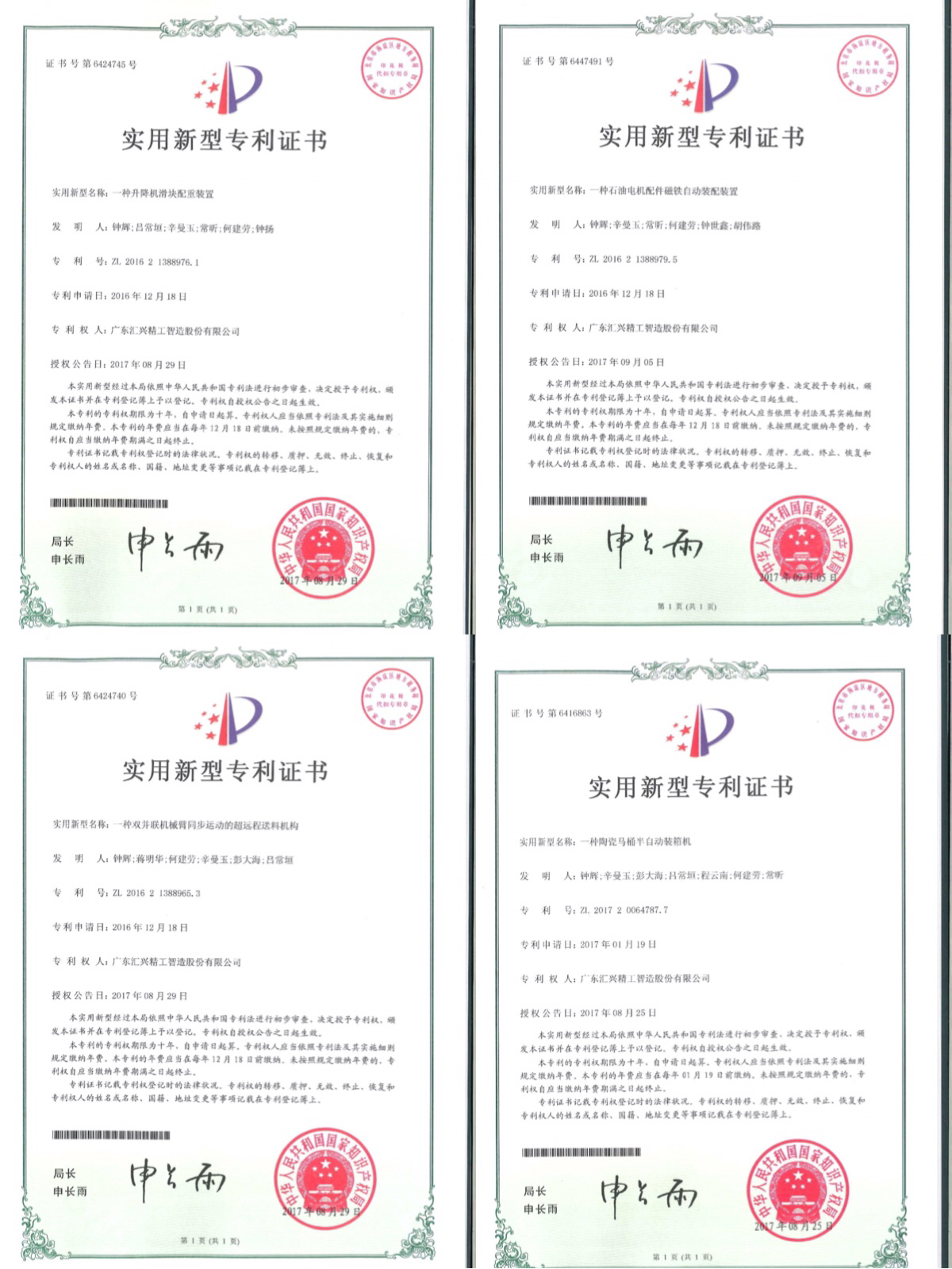 2017年9月25日,廣東匯興精工智造股份有限公司(股票代碼:839258)又獲得四項實用新型專利授權。關于一種升降滑塊配重裝置、一種石油電機配件磁鐵自動裝備裝置、一種雙并聯(lián)機械臂同步運動的遠超程送料機構、 一種陶瓷馬桶半自動裝箱機專利申請,經(jīng)中華人民共和國國家知識產(chǎn)權局專利審查局嚴格審查終于順利通過,獲得授權。迄今為止,公司授權專利數(shù)達39項,且研究試驗用資金投入今年花費比去年進一步增加。