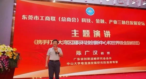 大會(huì)還邀請廣東省創(chuàng)新戰(zhàn)略研究會(huì)會(huì)長、中山大學(xué)粵港澳發(fā)展研究院首席專家陳廣漢教授作了《攜手打造大灣區(qū)國際科技創(chuàng)新中心和世界級(jí)金融樞紐》主題演講。陳廣漢教授就東莞在參與粵港澳大灣區(qū)建設(shè)的過程中,在推動(dòng)科技、金融、產(chǎn)業(yè)“三融合”方面的機(jī)遇與主要努力方向進(jìn)行全方位解讀。